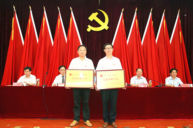 党委常委、副校长彭锦宣读了黄冈市委表彰的“两优一先”文件,宣读了校党委关于对2018年党建标杆学院、党建先进党支部、党员标兵、优秀党支部书记、优秀共产党员和优秀党务工作者的表彰文件。