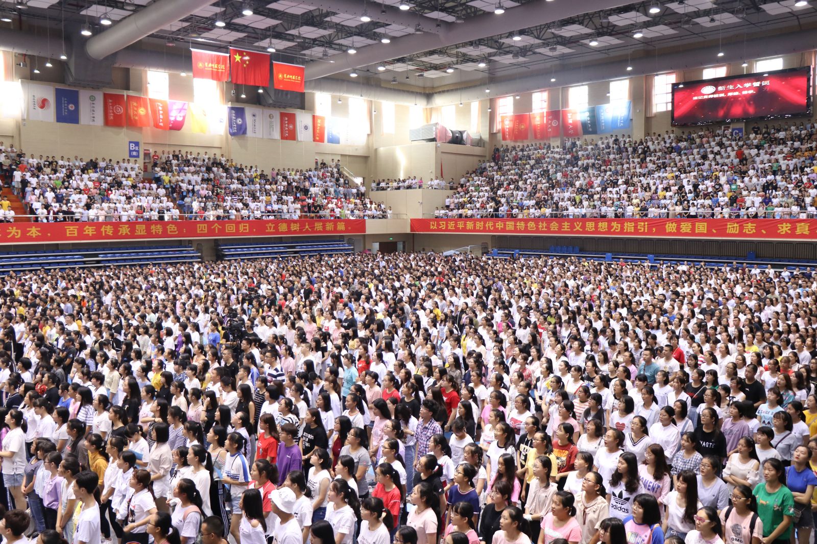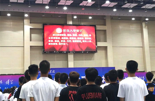 现场近6000名学生齐声诵读入学誓词,庄严承诺:要“谨记黄师校训,厚德、博学、力行、致远。传承黄师精神,尚师表、勇担当、秉诚朴、图自强。爱国、励志、求真、力行,尊师爱校,阳光上进,理性睿智,知行合一。”铿锵有力的诵读,展示了当代大学生的风采,开启了未来大学生活奋斗的新起点。