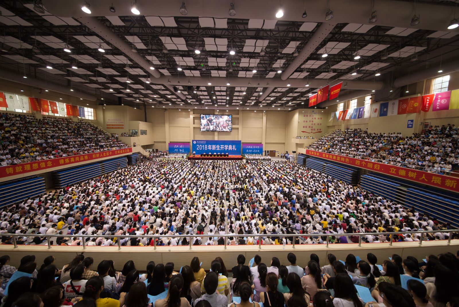 本网讯 9月5日,学校在体育运动中心举行2018年新生开学典礼。与程式化的开学典礼不同,今年的开学典礼以鲜明的主题、互动的形式、全新的理念、宏大的场面吸引了师生们的眼球,呈现出一个“不一样”的开学典礼。