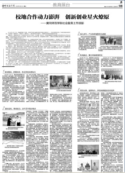 本网讯 12月21日,《中国教育报》第8版教育展台整版以《校地合作动力澎湃 创新创业星火燎原》为题,从“领导重视、统筹协调,各项举措保障有力”、“紧扣目标,精准发力,合作工作稳步推进”、“深入乡村,产业扶贫服务初见成效”、“扎根基层,着力开展教育帮扶”、“转型对路,服务有方,学校内涵建设明显提升”五个层面,报道了我校社会服务工作。