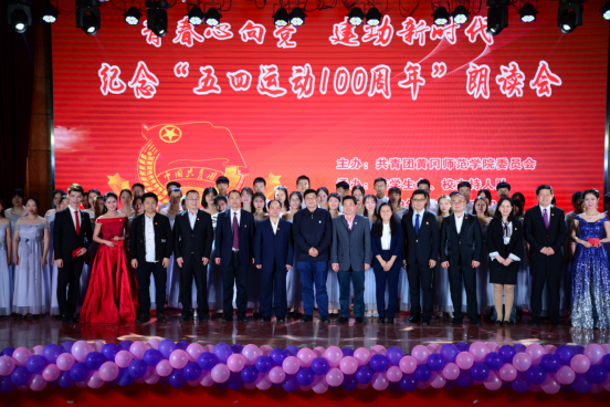一夕危亡,五四惊雷划破历史长夜;百年风雨,青春热血洗濯民族英魂。朗读会在《从1919到2019:在巴黎见证中国》中拉开序幕,重温了1919年巴黎和会上顾维钧的慷慨陈词,自豪讲述了2019年习近平总书记访问法国的热情礼遇,通过百年沧桑巨变,体现祖国的繁荣强盛。《闻一多家书》由新幕话剧社刘宇杰同学深情朗读,说到“国家育养学生,岁糜巨万,一旦有事,学生尚不出力,更待谁人?”时,台下观众热情鼓掌,深受感染。《奋斗的青春》由我校第四期青马班学员表演,他们通过对李大钊、江竹筠、雷锋、焦裕禄、郎平、王毅等人物的一一演绎,体现共产党人的坚强意志,诠释奋斗的青春最美丽,激情呐喊激励着每一位黄师学子努力奔跑,争做新时代的追梦人。《我和90后谈谈心》由化学化工学院副院长张万举博士朗读,他用贴近90后的语言与青年们亲切谈心,畅想祖国和民族的未来,勉励青年学生勤奋学习,积极参与社会实践,争做时代新人。持鸣黄师校主持队的同学们带来《青春心向党,建功新时代》,歌颂了与民族共命运,与时代同步的一代代中国青年,激励青年朋友们创造属于他们的青春伟业。朗读会上还特邀了音乐学院赵华、邹静两位老师领唱《我的祖国》,台上台下近千人共同合唱了《我的祖国》,师生们挥动小红旗,用歌声深情祝福伟大的祖国。朗读会在大学生合唱团带来的合唱《光荣啊,中国共青团》中落下帷幕。