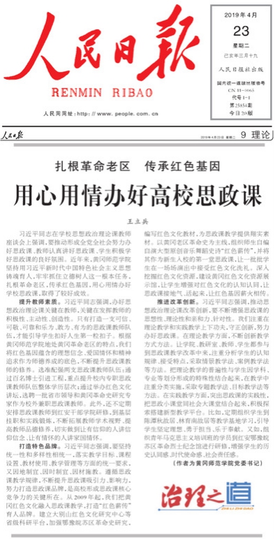 本网讯 黄冈师范学院如何用习近平新时代中国特色社会主义思想铸魂育人?4月23日,校党委书记王立兵在《人民日报》发表署名文章,作了深入阐释。