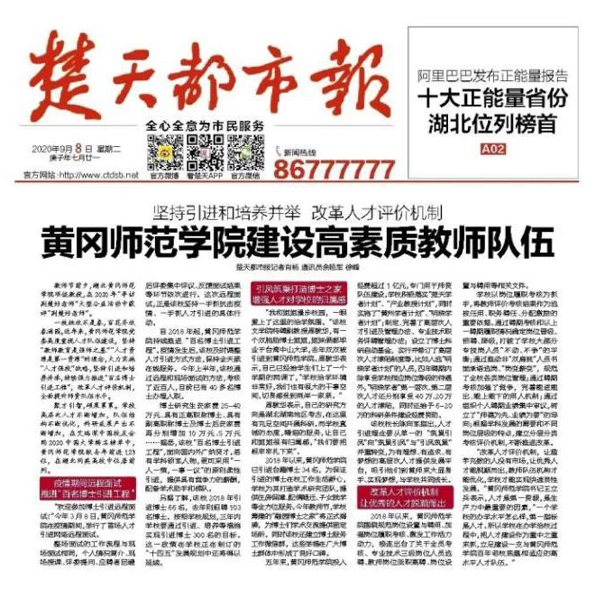 本网讯 9月8日,《楚天都市报》第A21版“群星争辉 桃李芳菲”栏目以《坚持引进和培养并举 改革人才评价机制 黄冈师范学院建设高素质教师队伍》为题,从“疫情期间远程面试 推进‘百名博士引进工程’”“引凤筑巢打造博士之家 增强人才对学校的归属感”“改革人才评价机制 让优秀的人才脱颖而出”三个方面,报道了近年来黄冈师范学院党委高度重视人才队伍建设,坚持“教师教育是强师之基”“人才资源是第一资源”的理念,大力实施“人才强校”战略,坚持引进和培养并举,持续强力推进“百名博士引进工程”,改革人才评价机制,全面提升师资队伍水平。