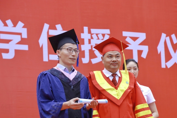 校学位评定委员会副主席、副校长夏庆利宣读了授予学位决定。身着学位服的毕业生依次上台,向全体校领导及学位评定委员会委员鞠躬行礼。