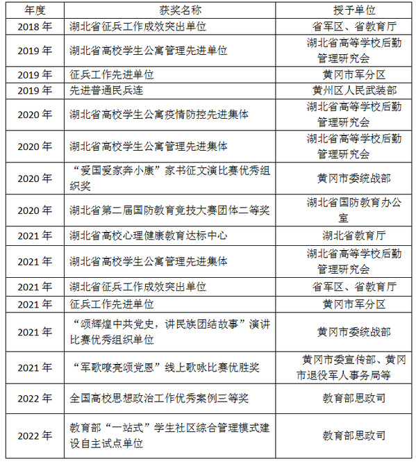 构建思想价值引领体系。每年组织全校新生观看《红色薪传》,传承红色基因。近4年来,组织校园辩论赛、礼仪风采大赛、“黄师杯”篮球赛等大型精品活动1000余场,组织学生党员、入党积极分子、学生干部开展各级各类劳动育人活动近100余次。在2020、2021年抗击新冠疫情中,涌现出了一批批黄师学子抗疫先锋,他们投身志愿服务、带头捐款捐物、制作抗疫歌曲,展现了黄师学子坚定的理想信念。成立大学生退役士兵宣讲团及大学生退役士兵服务社,开展爱国主义升旗仪式、爱国主义教育和国防教育200余次。四年来,共有400余名大学生应征入伍,报效祖国。黄冈师范学院人民武装部通过黄冈市军分区达标基层武装部验收,正朝着湖北省示范征兵工作站方向努力。