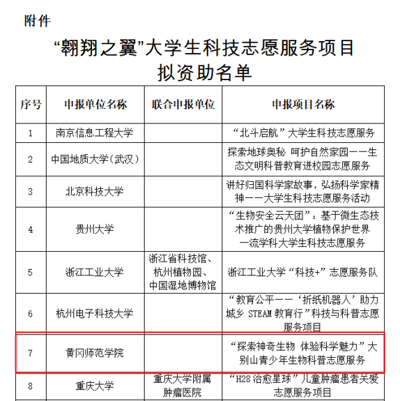 本网讯 近日,中国科协宣传文化部在全国实施的“翱翔之翼”大学生科技志愿服务项目已完成立项公示,我校生物与农业资源学院申报的《“探索神奇生物 体验科学魁力”大别山青少年生物科普志愿服务》获准立项。全国共100家单位获批“翱翔之翼”大学生科技志愿服务项目资助对象,我校以总评排名第七的成绩入选。