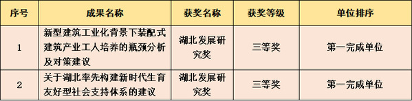 本网讯 近日,2020-2021年度湖北优秀调研成果和发展研究奖拟获奖成果公示,我校建筑工程学院周永团队的《新型建筑工业化背景下装配式建筑产业工人培养的瓶颈分析及对策建议》和地理与旅游学院江砥团队的《关于湖北率先构建新时代生育友好型社会支持体系的建议》荣获三等奖。