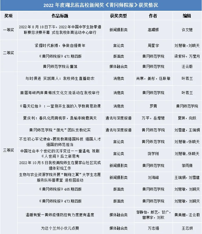 其中,《2022年8月18日下午,2022年中国中学生跆拳道联赛总决赛开幕式在我校体育运动中心举行》获新闻摄影类一等奖;《黄冈师院报》471期四版获版面类二等奖,《紧握时代脉搏,争做自强青年》获得言论类二等奖,《黄冈师范学院云廉馆》获媒体融合类二等奖;《2022年10月5日我校美院师生在晏家山社区完成墙体彩绘工作》、《生物与农业资源学院开展“翱翔之翼”大学生志愿服务队科普课堂进校园活动》获新闻摄影类三等奖,《黄冈师院报》465期四版、473期四版获版面类三等奖、《与时俱进 实践育人:我校师生直播助农》、《首届海峡两岸黄梅戏文化交流活动在我校举行》、《<霜天红烛>:一堂别开生面的入学教育思政课》获消息类三等奖;《夏庆利:春风化雨育桃李,桑榆非晚霞满天》、《黄冈师范学院“微光”团队支教纪实》获通讯与深度报道类三等奖;《不忘初心牢记使命,展现教育强国科技强国人才强国的师范担当》、《中国社会半个世纪的沉浮变迁——重温电视剧<人世间>后之新思考》获言论类三等奖;《温暖有爱—黄师疫情防控有力度更有温度》、《为这个兰州小伙儿点赞》获媒体融合类三等奖。