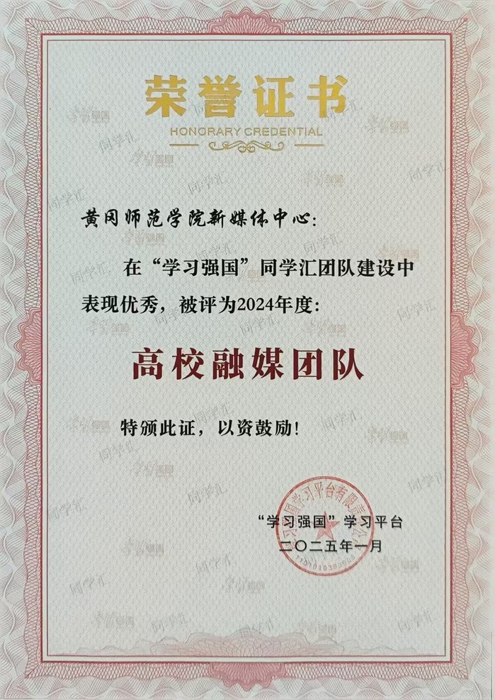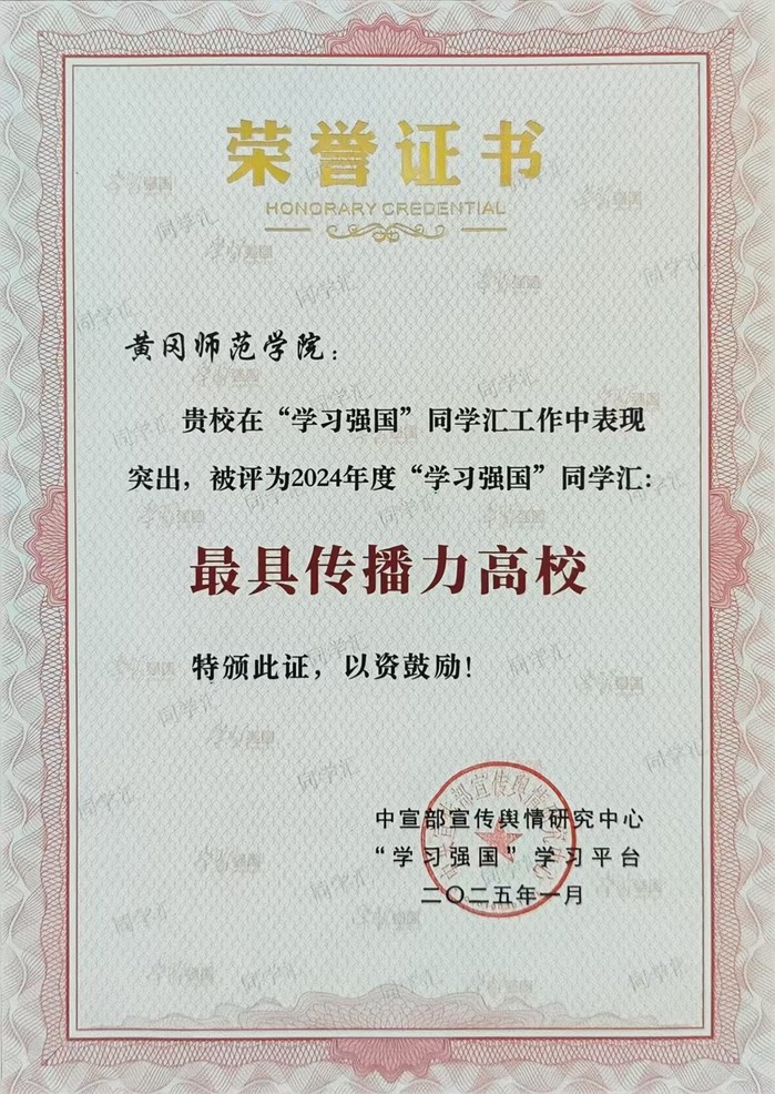 本网讯 近日,中宣部宣传舆情研究中心、“学习强国”学习平台公布了2024年度同学汇表彰结果,我校荣获“最具传播力高校”荣誉称号,全国共有52所高校获此殊荣,新闻作品《黄冈师范学院第二届本科教育教学节闭幕》获评2024年度人气作品(高校)Top100,党委宣传部王瑞娟和新媒体中心学生记者陆昭宇的2件作品获评2024年度人气作品(个人)Top100,黄冈师范学院新媒体中心获评2024年度高校融媒团队Top50。