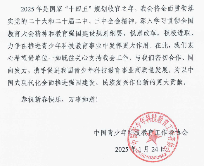 本网讯 值此新春佳节来临之际,中国青少年科技教育工作者协会向我校发来感谢信,对我校大力协助举办第九届“华夏杯”全国物理教学创新大赛暨物理教育与普及研究论坛表示感谢,并向全体教职工致以诚挚的节日问候和新春祝福!