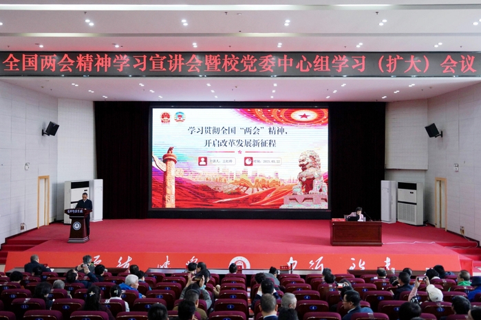 本网讯 3月22日上午,学校举行全国两会精神学习宣讲会暨校党委理论学习中心组2025年第2次理论(扩大)会议。省政协副主席、省黄埔同学会会长、湖北统促会副会长王红玲应邀作题为《学习贯彻全国两会精神,开启改革发展新征程》的辅导报告。省委统战部副部长江浩,省黄埔同学会副会长徐移山、卢纲,省黄埔同学会专职秘书长秦辉,黄冈市委常委、市委统战部部长李玲,省委统战部联络处处长、一级调研员易军等出席宣讲会。受校党委书记陈向军委托,校党委副书记、校长漆昌柱主持宣讲会。