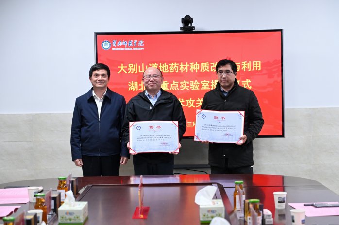 本网讯 3月28日下午,大别山道地药材种质改良与利用省级重点实验室揭牌仪式暨学术委员会第一次会议在李时珍中医药学院101会议室举行。校党委副书记、校长漆昌柱,副校长马志斌,市科技局党组书记姜宽及重点实验室学术委员会专家等出席活动。