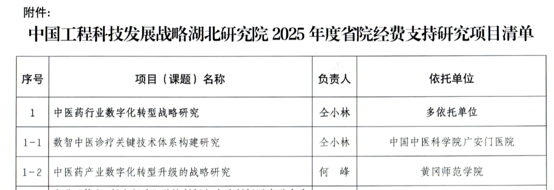 本网讯 近日,2025年度中国工程科技发展战略湖北研究院咨询研究项目立项名单正式公布,由我校联合中国中医科学院广安门医院申报的重点项目“中医药行业数字化转型战略研究”成功获批。