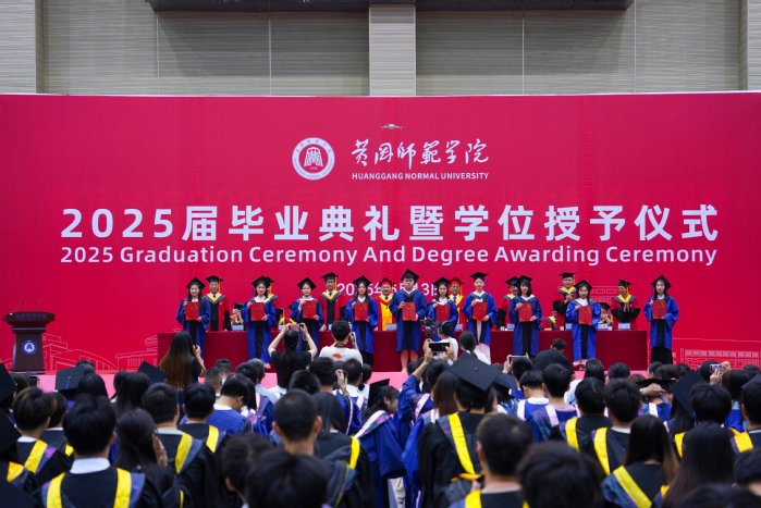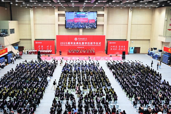 全场师生齐唱黄冈师范学院校歌,以激昂的旋律表达对母校的祝福和热爱,2025届毕业典礼暨学位授予仪式在歌声中落幕。