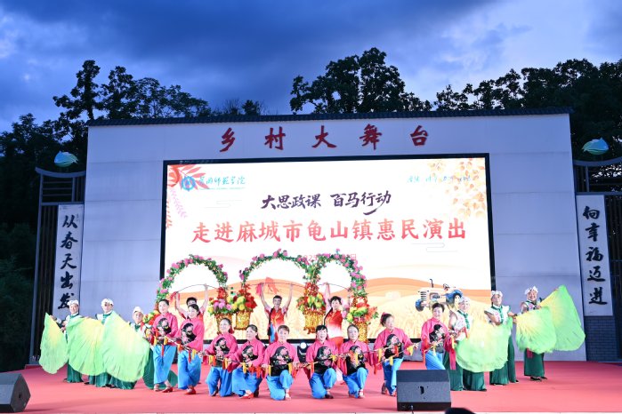 惠民活动阶段,我校联合麻城市文化馆于当晚在龟山镇长寿湖公园百姓大舞台为当地民众送上了一场精彩的文艺演出。湖北省非遗项目“麻城花挑”舞蹈《了了喂》和民歌《十把扇子》展现了地域文化魅力,《祖国万岁》《再见大别山》《听见中国》等红歌联唱激荡爱国情怀,二胡独奏《赛马》等节目轮番登场,我校音乐学院、黄梅戏学院潘柠静老师的黄梅戏《谁料皇榜中状元》更是将活动气氛推向高潮。惠民演出活动赢得观众阵阵掌声,为当地群众带来了一场文化盛宴。