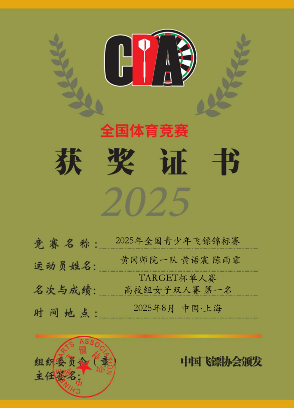 体育学院高度重视、精心组织本次比赛,教练员邓建伟、李明全程指导、科学训练,参赛选手精神饱满、苦练打赢本领,为大赛优异成绩的取得奠定了坚实基础。在比赛中,我校学子敢打敢拼,凭借顽强的意志和精湛的飞镖技艺,打出了风采,赛出了水平,展现出黄师学子勇于担当、敢于作为的良好精神风貌。