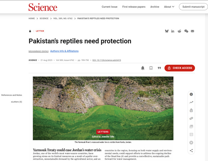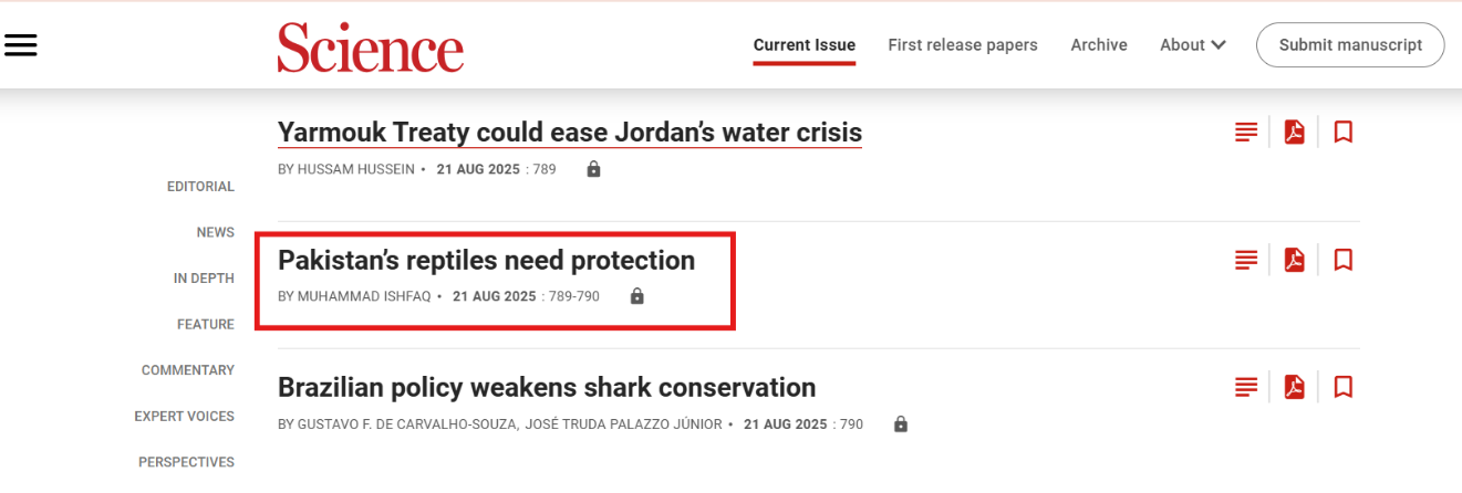 本网讯 8月21日,我校计算机与人工智能学院教师Dr. Muhammad Ishfaq在国际知名期刊Science杂志以Letter形式发表评论文章“Pakistan’s Reptiles Need Protection”,黄冈师范学院为第一作者及通讯作者单位。