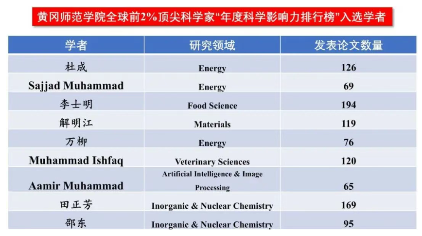 当地时间9月19日,美国斯坦福大学和国际权威学术出版社爱思唯尔共同发布了2025年全球前2%顶尖科学家榜单,黄冈师范学院杜成、Sajjad Muhammad、李士明、解明江、万柳、Muhammad Ishfaq、Aamir Muhammad、田正芳、邵东9位学者入选“2025年度科学影响力排行榜”榜单。入选学者主要贡献学科方向涵盖Energy、Food Science、Materials、Veterinary Sciences、Artificial Intelligence & Image Processing、Inorganic & Nuclear Chemistry等多个领域。