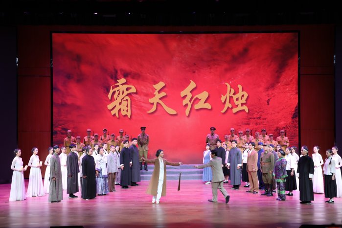 《霜天红烛》是黄冈师范学院近年来精心打造的一部大型黄梅戏精品力作,曾获国家艺术基金资助并荣获湖北省第十一届屈原文艺奖。该剧以黄冈师范学院建校发展历程为背景,通过婉转悠扬的黄梅调,用革命战争年代,以“黄师兰”为代表的黄冈教师群体不畏牺牲、坚持办学的感人故事生动诠释了大别山精神。作品将战争年代的家国大义、百廿师范的奋斗历程与黄梅戏的婉转唱腔巧妙融合,深刻诠释了“立德树人、铸魂育人”的时代主题,堪称一堂“行走的文艺思政课”。今年,《霜天红烛》入选2025年教育部、文旅部、财政部高雅艺术进校园项目,首站于9月下旬赴宁夏中卫职业技术学校演出,此次赴皖西学院演出是巡演的第二站,也是该剧的第70场演出。
